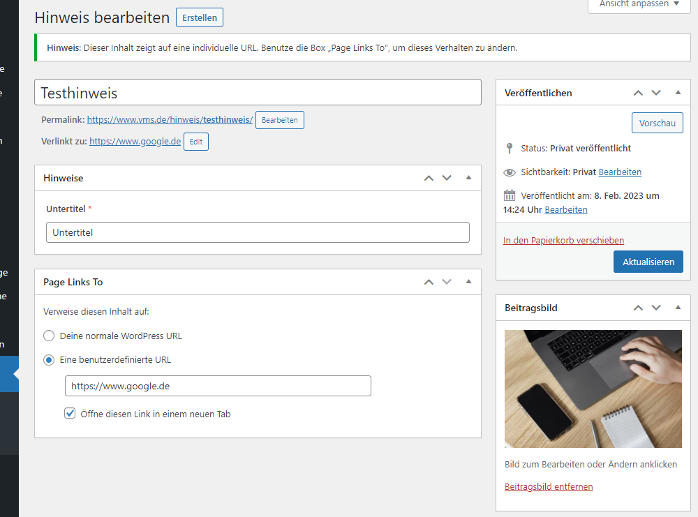 Für jeden Hinweis können ein Beitragsbild, Titel, Untertitel und ein interner oder externer Link festgelegt werden.