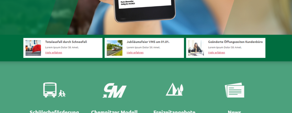 Die Hinweise, die unter der Fahrplanauskunft auf der Startseite angezeigt werden können, werden im Backend im Bereich „Hinweise (Startseite)“ gepflegt.